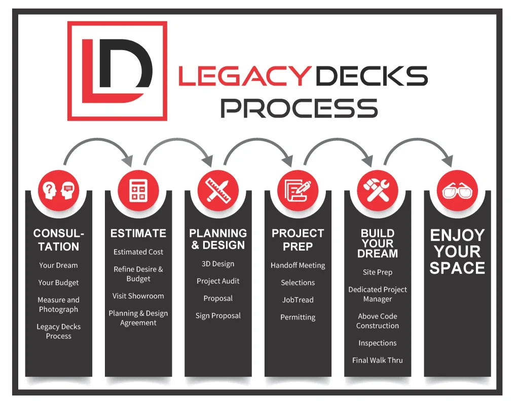 At Legacy Decks, we believe a proven, effective process creates ease. It provides a roadmap for the journey, outlines next steps, and gives a clear path to the finish line. This takes the guesswork out of your experience, allowing you to always be informed about the current status of your project within our well-defined process.